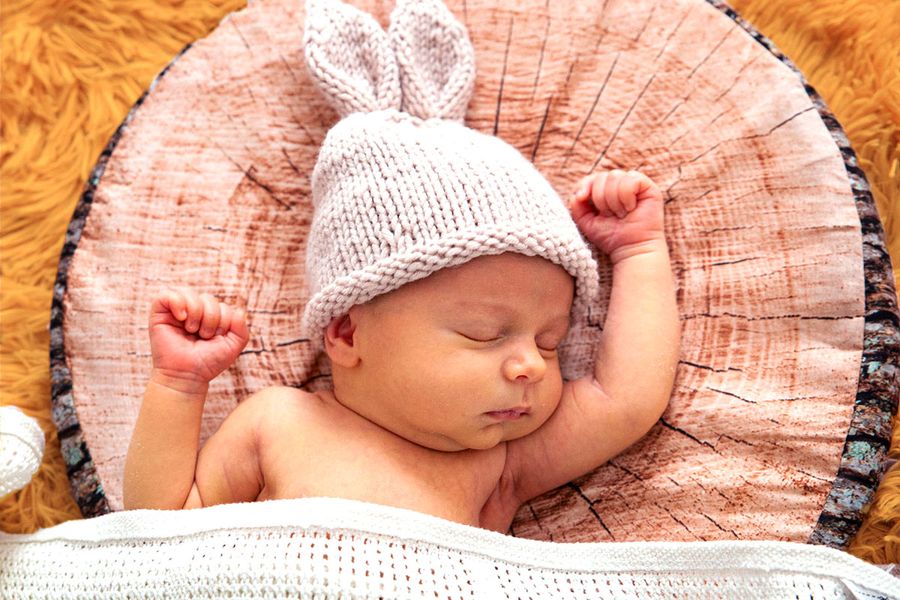 Newborn babies love to sleep, and this can be an excellent time to hold your mini photo shoot. After all, there’s no prettier sight than a tiny little baby all snuggled up and sleeping like… well, like a baby! However, the clacking of your camera could potentially wake your little one up and ruin the session. To get around this problem, consider playing some white noise in the background, which will recreate the soothing sounds of the womb and help your baby sleep through all the action.