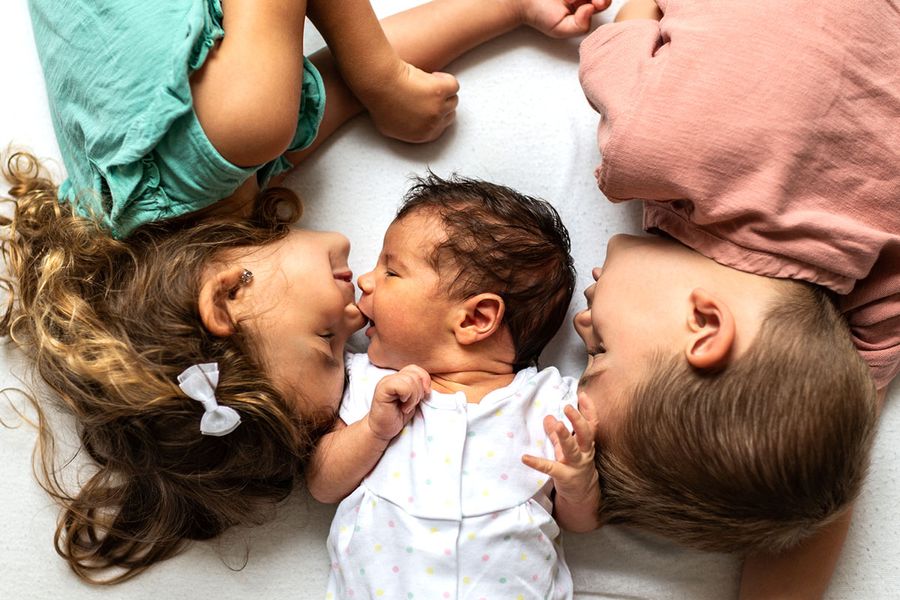 Bonus tip: If your newborn is awake, see if you can capture the new siblings interacting with each other. A little bit of eye-contact can really make for a touching family photo.